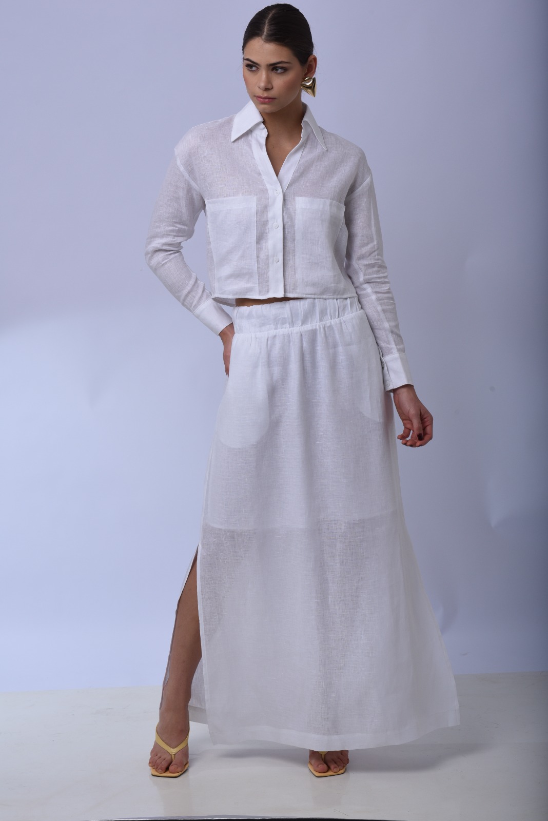 Conforto e sofisticação em cada detalhe. Feita em cambraia de linho leve, essa saia traz caimento suave. Ideal para usar com a camisa e arrasar com o conjunto!